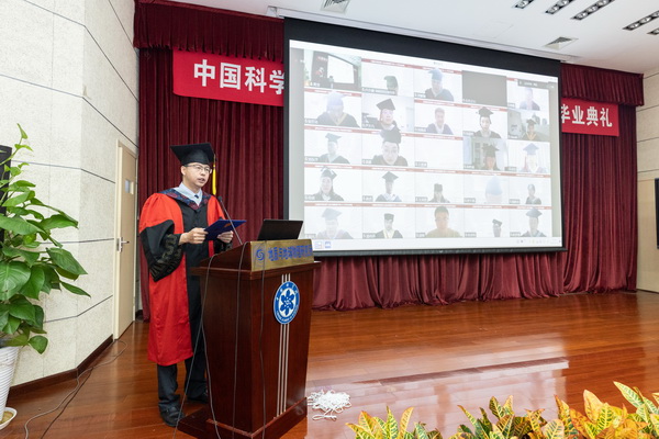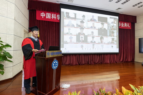 所长底青云院士,所学位委员会主任潘永信院士,所党委书记张小雷研究员,副所长、所学位委员会副主任魏勇研究员,所党委副书记、纪委书记杨俊成,副所长杨石岭研究员,所学位委员会副主任彭澎研究员等出席毕业典礼。毕业典礼由魏勇主持。所学位委员会成员、导师代表、2022届毕业生、毕业生亲属等在线参加了毕业典礼。