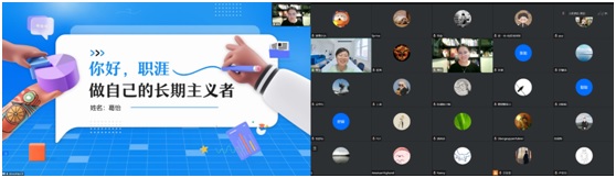1027日晚上19:00,“你好,职涯!做自己的长期主义者”主题讲座通过线上会议形式开展,主讲嘉宾为中国科学院大学心理健康教育中心的葛怡老师。葛怡老师分析了2022大学生就业力调研报告,介绍了毕业生的就业去向及就业期待,帮助同学们了解在不同的年龄段如何合理规划自己的职业生涯,并提出要学会调节自己的就业情绪。最后,葛怡老师解释了如何做个人的长期主义者,分享了一些求职技巧,并对参会同学的提问作出解答。
