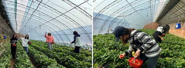 中午11:00到达第二站——草莓园。在工作人员的指导下,同学们拎着采摘篮去往不同品种的种植棚。进入棚中,一股清新香甜的味道迎面而来,熟透的草莓挂在翠绿的枝上,垂着圆圆滚滚的身子,品质非常好。在采摘过程中同学们不仅放松了身心,也体验到劳动的快乐,最终还收获了鲜甜多汁的草莓和靓丽的田园美照。