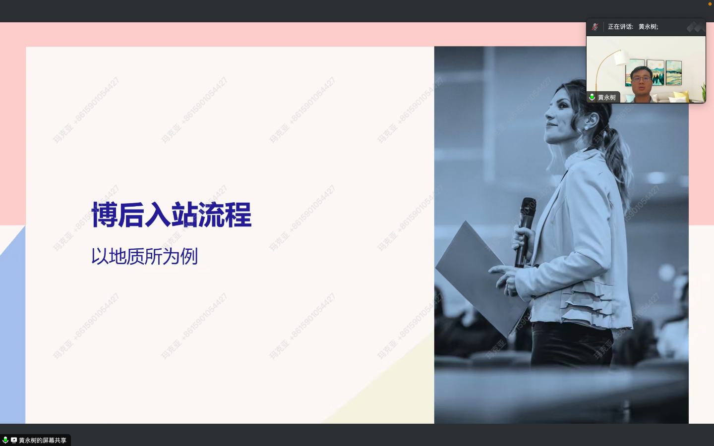 毕业生黄永树分享了他从一名博士生成长为一名博士后的心历路程,对比了博士和博士后期间的科研工作和成果产出,以及在面试过程中的经验和策略,并对参会同学们的提问做出解答。