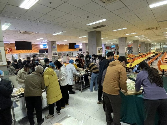 12月20日下午4点,同学们陆续来到现场,佩戴上口罩、做好手部清洁后,同学们迅速分组,选择自己心仪的饺子馅料,兴致勃勃地在桌前摩拳擦掌,准备大显身手。食堂包饺子师傅为同学们示范擀皮和饺子的包法。同学们有的手法娴熟,一捏一挤,一个个饱满圆润、创意形态的饺子便整齐地排列在盘中;有的则是初次尝试,略显生疏,但在旁边同学的耐心指导下,也逐渐掌握了技巧,包出的饺子有模有样。大家一边包饺子,一边分享着自己家乡的冬至习俗和趣事,交流着科研中的点滴心得,现场气氛温馨融洽,热闹非凡。