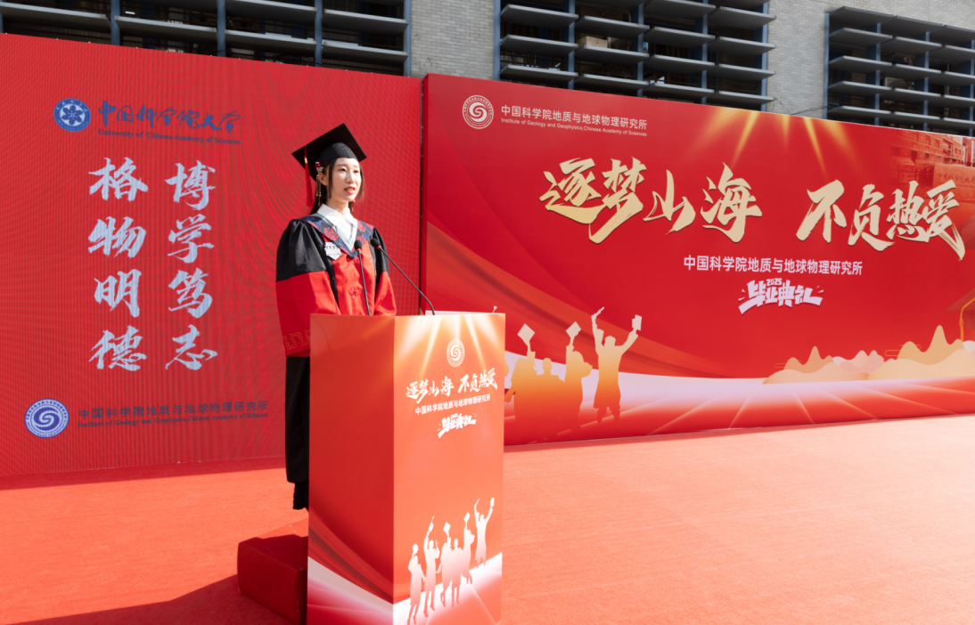 崔静怡代表毕业生发言。她表示将铭记中国科学院大学和研究所的教导,保持内心的坚定和信心,以真才实学服务社会,为国家的发展贡献力量。