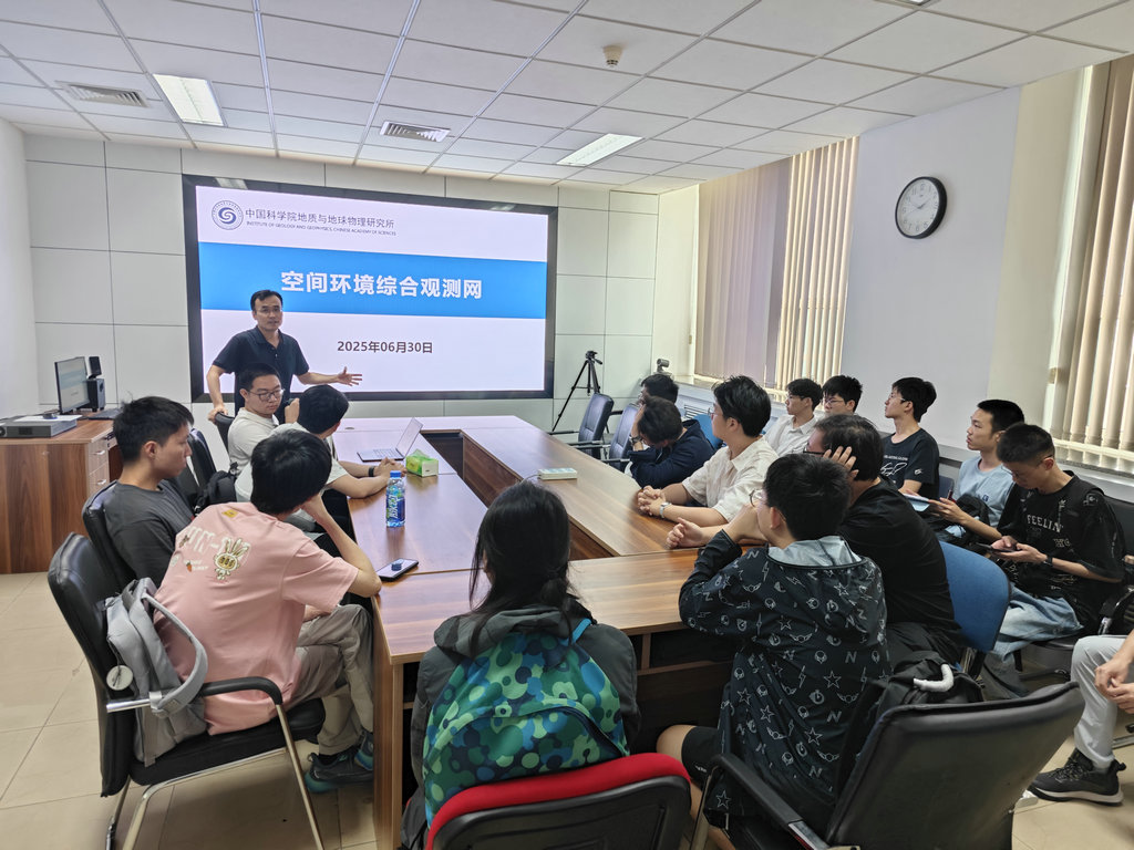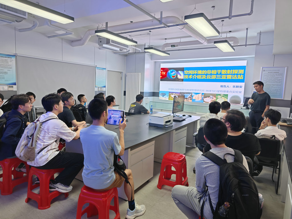 我所地球与行星科学中心任志鹏研究员、乐新安研究员和胡连欢高级工程师分别围绕空间物理学、行星物理学及空间探测技术等学科前沿热点作了相关的学术报告,并与同学们就学科前沿问题、学习和科研工作方法等进行了互动交流。学习期间,组织参观了研究所的空间环境探测实验室和非相干散射雷达实验室。同学们对研究所空间环境探测的整体布局、运行监控及数据共享等多个方面进行了解。