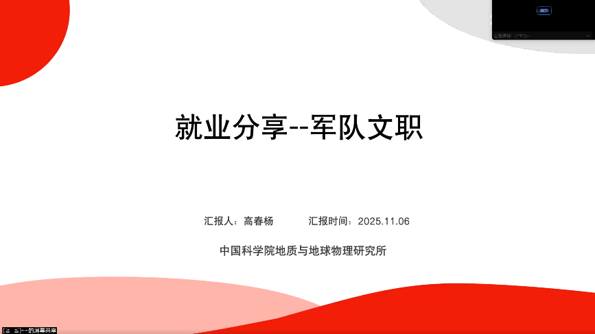 毕业生高春杨分享了她从军队文职岗位重返学术道路的心路历程,详细介绍了军队文职的报考流程、工作性质、薪酬福利与发展路径,为有意向进入军队文职系统的同学提供了实用指南。