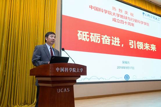 国科大地学院院长、我所所长吴福元院士代表地学院,向出席庆典活动的各位领导、各位来宾、各位校友表示热烈地欢迎,向全体师生表示热烈地祝贺,向关心地学院发展的各界人士表示衷心地感谢。吴福元简要回顾了地学院为国家科技创新、经济发展、人才培养和科教融合做出了卓越的贡献的历史,展望未来,地学院桃李满天下,为国家培养更多的高层次人才。