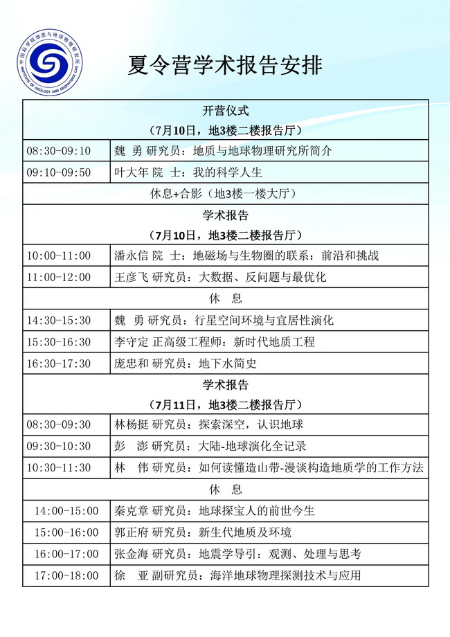 【7.9-7.13】第五届地球与行星科学大学生夏令营日程及学术报告安排