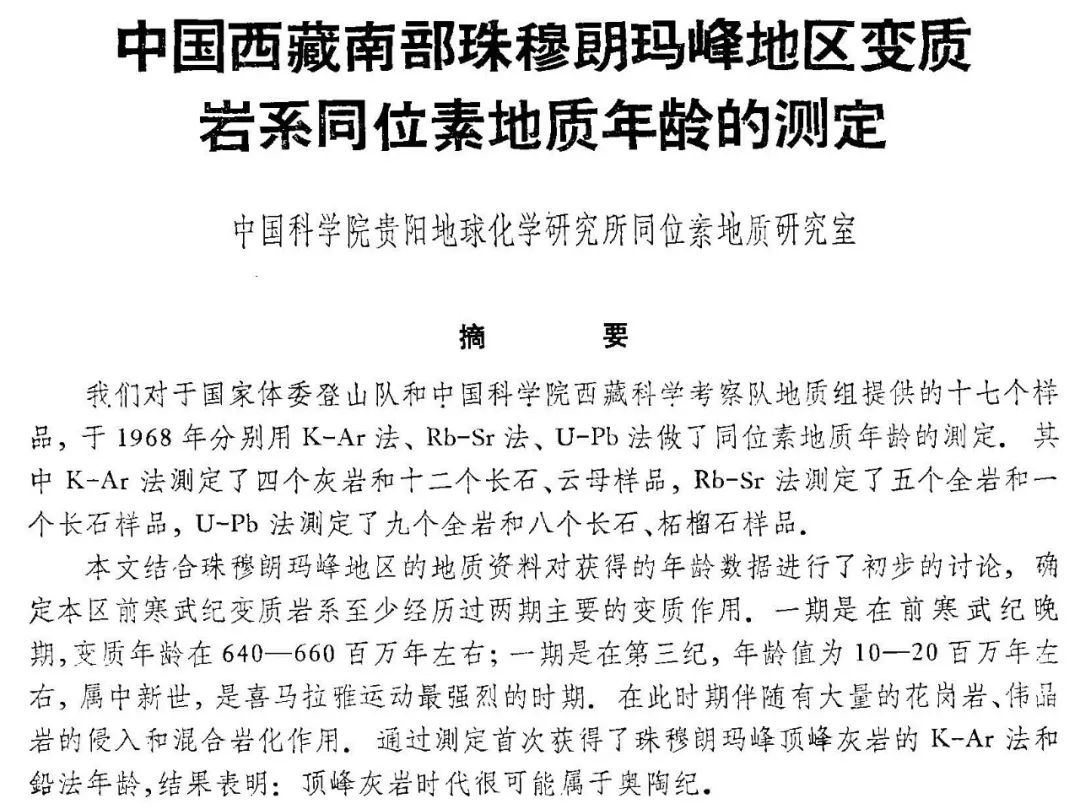 在我国同位素地球化学奠基人李璞的带领下,中国科学院科研人员于1973年首次测定珠峰峰顶灰岩年龄约为4.7亿年,这一结果也被该区域灰岩中发现的奥陶纪海相化石所印证,自此也证明了珠峰以及喜马拉雅山远古时代曾处于特提斯海之下。