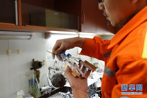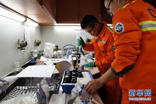 1月9日,科考人员在“海洋六号”实验室内处理南极海底泥与底层海水样本。新华社记者王攀摄