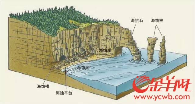 八十年前(1937 年5 月14 日) ,吴尚时教授在广州市海珠区七星岗南麓,发现了一组海蚀地貌:在一片裸露的红色岩系砂砾岩陡崖前面连着一片宽敞的海蚀平台,陡崖下部有一连串半米深左右的海蚀洞,使上部成为额状突出,高约2米。这些海蚀崖、海蚀洞穴和海蚀平台是六千年前海浪拍击冲蚀而成的遗址,说明当时南海海岸就在这里,前面大片农田绿野原是汪洋大海。