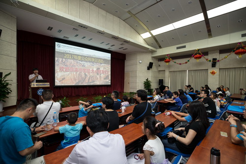 活动特邀郭正堂院士作了题为“从黄土高原看华夏山水的由来”的科普报告。郭正堂院士以金庸小说《书剑恩仇录》中的一首诗为引子开始其报告,生动地为大家讲述了华夏山水的由来,现场气氛活泼热烈,小朋友和家长们在随后的互动环节中都提出了富有专业性和想象力的问题。