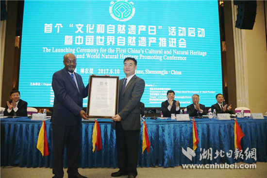 会上,联合国教科文组织副总干事格塔丘·恩吉达向神农架授予了世界自然遗产牌匾。湖北省丹江口水库等第九批19处国家级风景名胜区也被正式授牌。中科院院士、中国地质科学院岩溶地质研究所研究员袁道先,世界自然保护联盟资深专家、加拿大原班芙国家公园园长吉姆 桑塞尔,中科院院士、中科院地质与地球物理研究所研究员刘嘉麒,世界自然保护联盟资深专家约翰马敬能,世界自然保护联盟亚洲办公室高级协调员斯科特珀金,清华大学建筑学院副院长吕舟,世界自然保护联盟资深专家、瑞士环境部顾问皮埃尔加兰德等7位专家结合中国世界自然遗产地的保护工作分别作了主题报告。安徽黄山、山东泰山、重庆武隆和湖北神农架在会上作了交流发言。