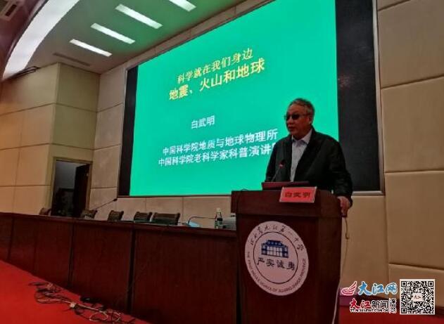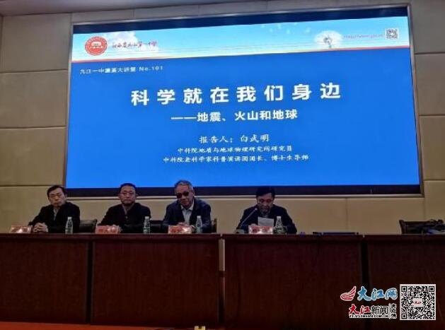 大江网/大江新闻客户端讯 毛国俊、吕良艳报道:12月7日晚,中国科学院老科学家科普演讲团团长、800彩票研究员、博士生导师白武明教授走进九江一中濂溪大讲堂,以《科学就在我们身边——地震、火山和地球》为题开展了一场科普讲座。九江市科协党组书记、主席周光灿,九江一中校长万金陵、九江一中副校长周明学,九江市科协、九江市文明办、浔阳区科协、浔阳区文明办的领导和嘉宾出席了讲座,九江一中南湖校区高一年级200余名学生聆听了本场讲座,讲座由周明学副校长主持。