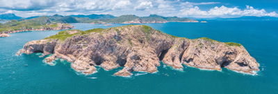 图为香港地质公园瓮缸群岛——横洲,小岛展示了柱状节理,以及海蚀崖、海蚀洞、海蚀拱等海岸侵蚀地貌。