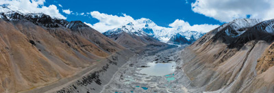 图为珠峰北坡,最远处为珠峰,中部是绒布冰川,近处是绒布冰川湖,两侧为绒布沟壁,壁上黑白岩石分界处即为绒布峡谷藏南拆离系。