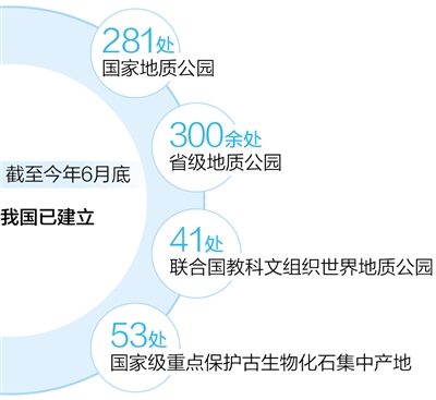 中国地质调查局中国地质科学院地质遗迹研究室副主任王敏说,截至今年6月底,中国拥有联合国教科文组织世界地质公园41处,总面积5万余平方公里。同时,还拥有国家地质公园281处,都已成为以国家公园为主体的自然保护地体系的重要组成部分。