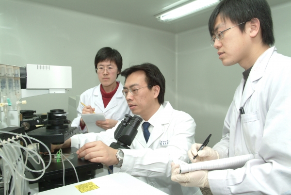中国科学院院士,国科大学副校长、博士生导师,中科院生物物理研究所研究员徐涛教授在实验室给学生做操作示范
