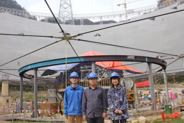 喻业钊(左一)和导师彭勃研究员(中)在FAST现场