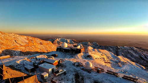 2020年冬季赛什腾雪后的夕照,整个天文台笼罩在落日余晖中,远处是辽阔的柴达木盆地。供图/邓李才