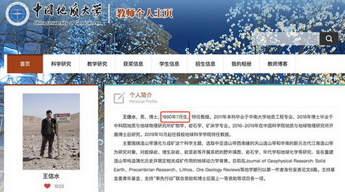 中国青年报(ID:zqbcyol)注意到,中国地质大学的官网显示,王信水出生于1990年,2019年成为该校特任教授。