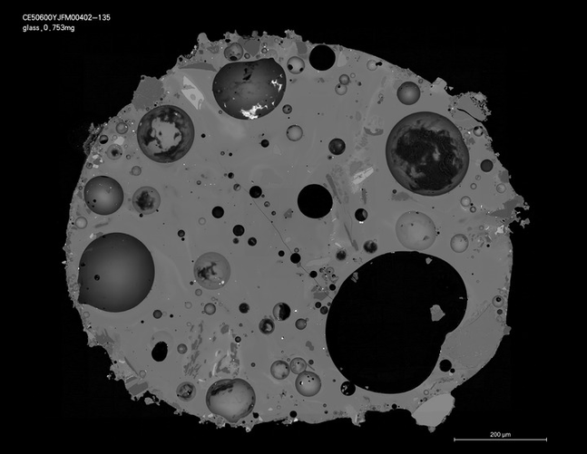 这是4月10日拍摄的嫦娥五号月壤中的一颗玻璃珠的横截面背散射电子图像。(中科院地质与地球物理研究所供图)