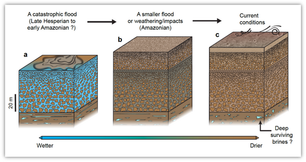 研究人员发现,该区域数米厚的火星土壤层之下存在两套向上变细的沉积层序:第一套层序位于火星表面以下约10至30米,含有较多石块,其粒径随深度逐渐增大;第二套层序位于火星表面以下约30至80米,其石块粒径更大,可达米级,且分布更为杂乱,反映了更古老、更大规模的火星表面改造事件。