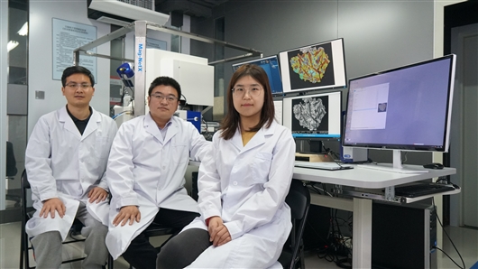 论文主要作者合影,从左至右分别为苏斌、陈意、原江燕。背景仪器为分析嫦娥五月壤的扫描电镜,背景屏幕图片为嫦娥五月壤。 受访者供图