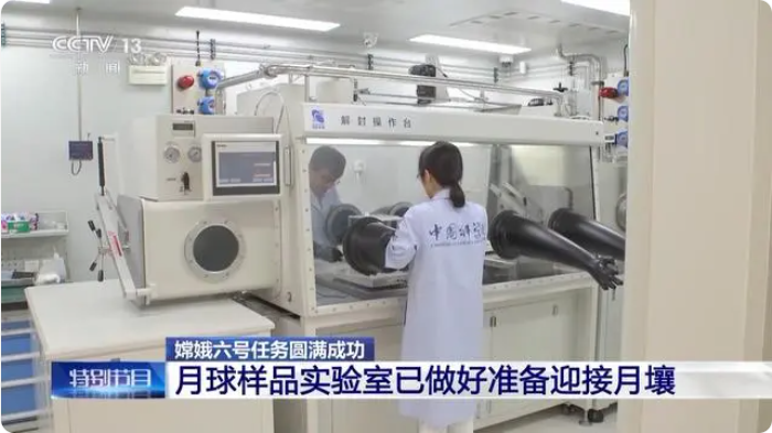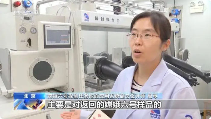 嫦娥六号探测任务地面应用系统副总设计师 周琴:我们这间主要放了一个解封操作台,主要是对返回的嫦娥六号样品的密封封装装置进行解封处理,它是一个充氮的环境,里面的压力会高一点,外面压力低一点,避免了大气环境对手套箱里面的样品会造成污染的可能性。