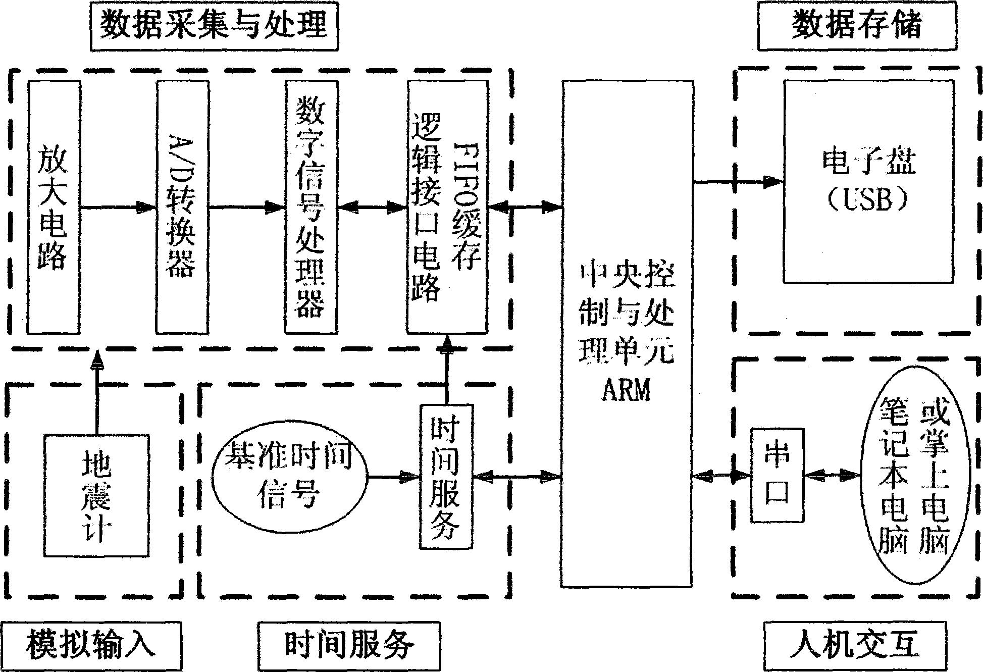 本实用新型提供一种基于ARM的地震数据采集系统。能同时处理三道来自于传感器的模拟信号,由模拟数字转换器将其转换为数字信号,经由数字信号处理器进行数据处理,经接口逻辑电路与中央控制与处理单元ARM相连,通过ARM完成系统的控制、采集、授时、存储等过程,同时该系统设计有一个高精度的时间服务系统,能够长时间稳定地为数据采集提供百微秒以下级别的时间服务,数据存储采用Usb盘的方式,系统的操作控制采用RS232协议,通过笔记本或palm型掌上电脑均可完成。