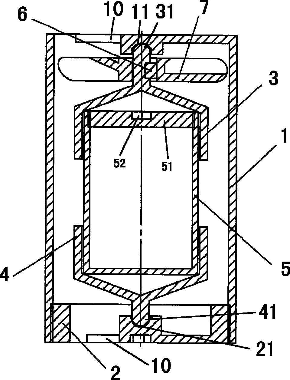 一种用于快中子辐照自动旋转的装样装置,其包括:一端为可拆卸的外筒,其上、下两端面开有多个扇形孔,以保障水流顺畅;外筒内部设有一内罐体,该内罐体为带底筒状,其开口的一端设有一盖;内罐体的两端分别套在上旋转盖及下托盘中,上旋转盖支撑在外筒的上端面内,下托盘支撑在外筒的底端内;上旋转盖的轴杆上固定有叶轮,由上旋转盖及下托盘的支撑以及叶轮的转动使内罐体在通过外筒两端扇形孔的水流作用下旋转。本发明解决了样品快中子照射横向不均匀问题,且加工简单,使用方便,不会对反应堆造成安全问题。本发明照射后没有放射性,可重复使用。