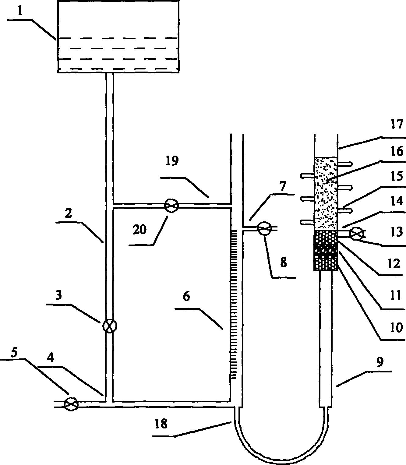 一种量测多孔介质毛细水上升高度与速率的试验装置,其特征是该装置包括水箱(1),下水管(2),下水管开关(3),三通接头(4),三通开关(5),测压管(6),溢水管(7),溢水管开关(8),毛细管(9),下透水石(10),粗砂(11),上透水石(12),排气管开关(13),排气管(14),取土孔塞(15),试样(16),试样筒(17),塑料管(18),补水管(19),补水管开关(20)。该测量方法所用仪器制造简单,测量精度高,使用方便,满足样品毛细水上升高度控制要求,可以直接测定各种多孔介质包括砂、砂土、粉土的毛细水上升高度与速率等参数,可用于土木工程中遇到的各种多孔介质毛细水上升高度与速率等参数的室内或现场测试。 |