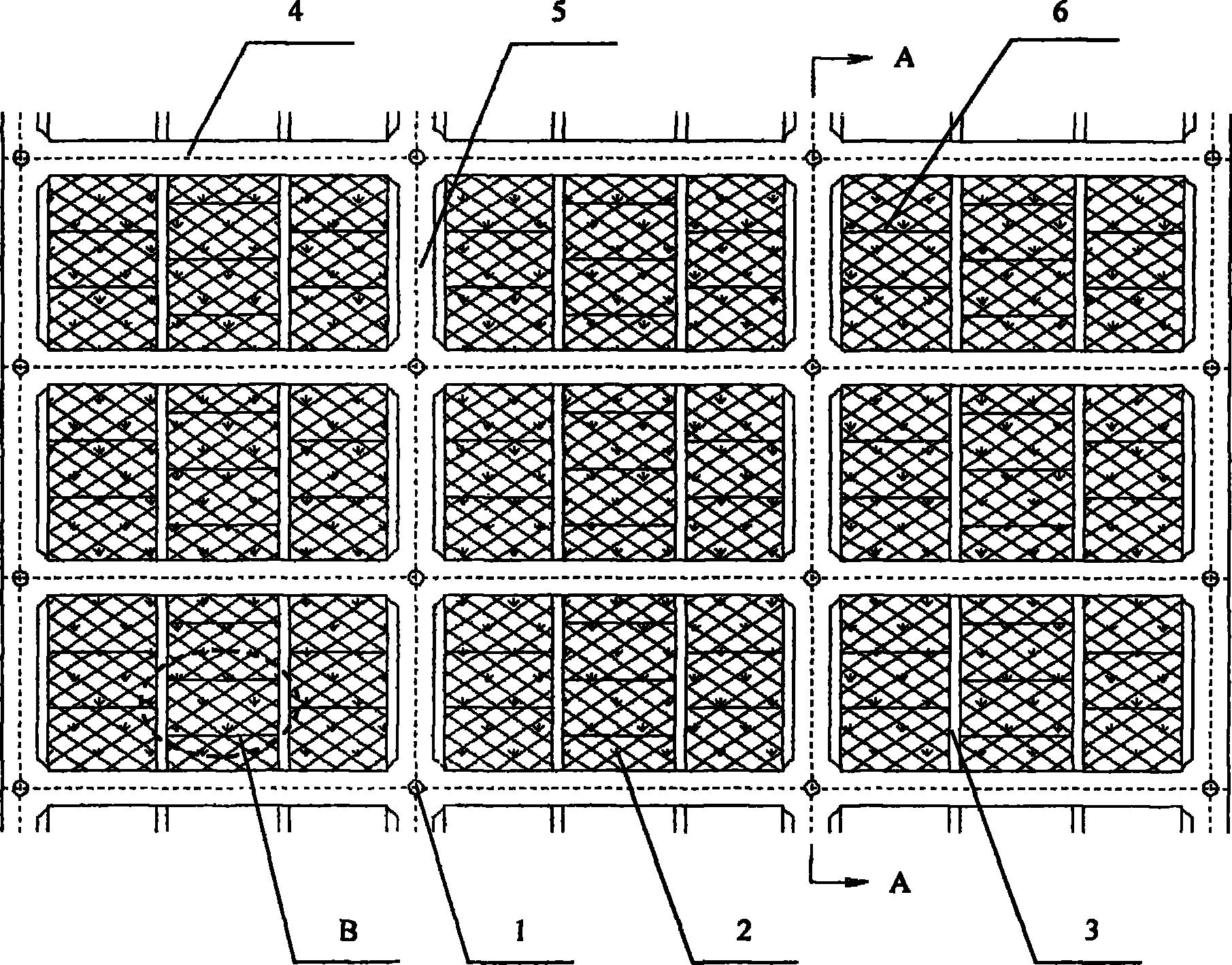 本发明是山区公路环保节能型边坡防护竹木格构梁,其特征是将竹桩与木片结合使用,进行边坡深层与浅层联合防护,利用一种改良土进行培植绿化,竹桩节节贯通,入土端削尖,竹桩表面刻有注浆孔,注浆孔均匀分布,横向肋梁与竖向肋梁采用混凝土或钢筋混凝土材料,进行现浇施工,竹木格构梁为预制拼装结构,采用竹子作为竖向竹肋柱,采用木片交叉方式构成菱形格构,竖向竹肋柱直径为8-11cm,竖向竹肋柱之间采用木片作为横向木支撑,横向木支撑与竖向竹肋柱连接,支撑菱形格构重量,格构内培植改良土,改良土由当地壤土与改良剂组成。本发明优点是:施工简单,就地取材,绿色环保,节约能源,满足生态边坡防护的要求。适用于土木工程中遇到的各种深层与浅层土质边坡绿化防护工程。 |