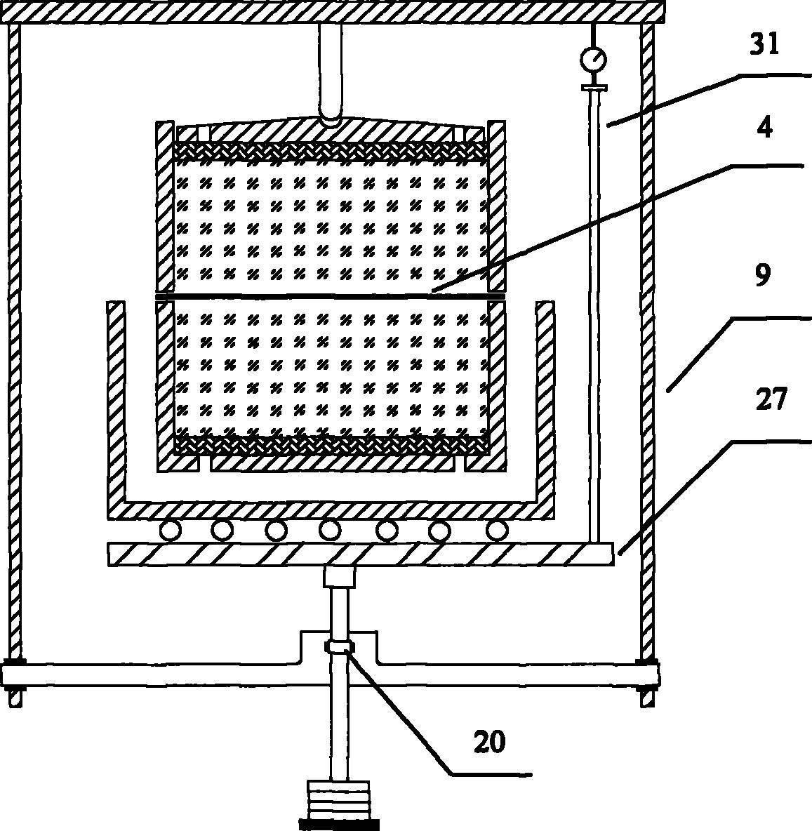 一种岩土体土工格栅抗拉直剪测试仪器,其特征是该仪器由拉拔步进电机(1),拉拔量力环(2),上试样盒(6),加压框架(9),下试样盒(13),下底座(14),剪切量力环(15),剪切步进电机(16),加压杠杆(23)和砝码(25)组成。该仪器制造简单,测量精度高,使用方便,满足土工格栅在加载条件下的抗拉拔与抗剪切强度量测控制要求,可直接测定各种土工格栅在多孔介质(包括砂土、粉土、粘土等)中的抗拉拔与抗剪切强度特性。