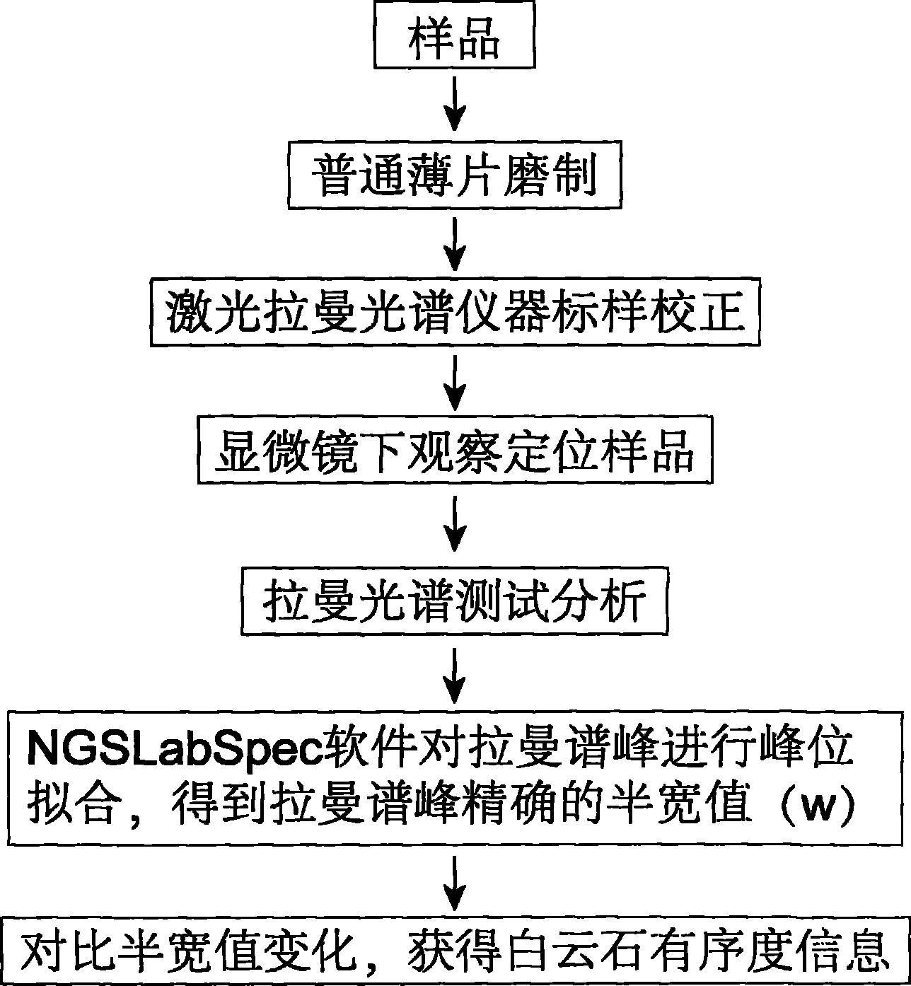 本发明涉及一种基于激光拉曼测定白云石有序度的方法,拉曼峰的形态和半宽充分揭示了白云石结构中原子和分子的振动信息与样品有序度的关系。白云石具有六个典型拉曼特征峰,其中299cm-1峰位的半宽对白云石有序度的变化反映最好,有序度越高,该峰位的半宽值越小,规律性明显;而1097cm-1峰位的半宽对白云石有序度的变化规律与299cm-1恰恰相反,有序度越高,拉曼半宽值越大。白云石的拉曼光谱分析中的半宽参数,可以作为表征样品有序度程度的分子级指标,在白云石成因机理研究中有广泛应用前景。