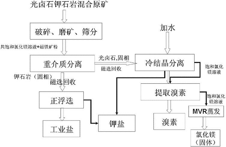 一种光卤石矿重介质选矿方法,主要步骤为:a)原矿破碎、磨矿、筛分;b)在固相条件下进行重介质分离,分离去除氯化钠;c)根据所选择的重介质种类不同,对分离得到的富集光卤石进行冷结晶分离或者热溶结晶分离,得到氯化钾产品;d)在产生的尾液中提取溴素。本发明克服了目前光卤石矿选矿中的三个主要缺点:在选矿的第一个步骤就大量排放饱和氯化镁溶液;可以大幅度提高钾盐的回收率,因为在非溶解的重介质中分离不会溶解氯化钾;可以大幅度减少后续选矿处理过程中的能耗和水耗等。