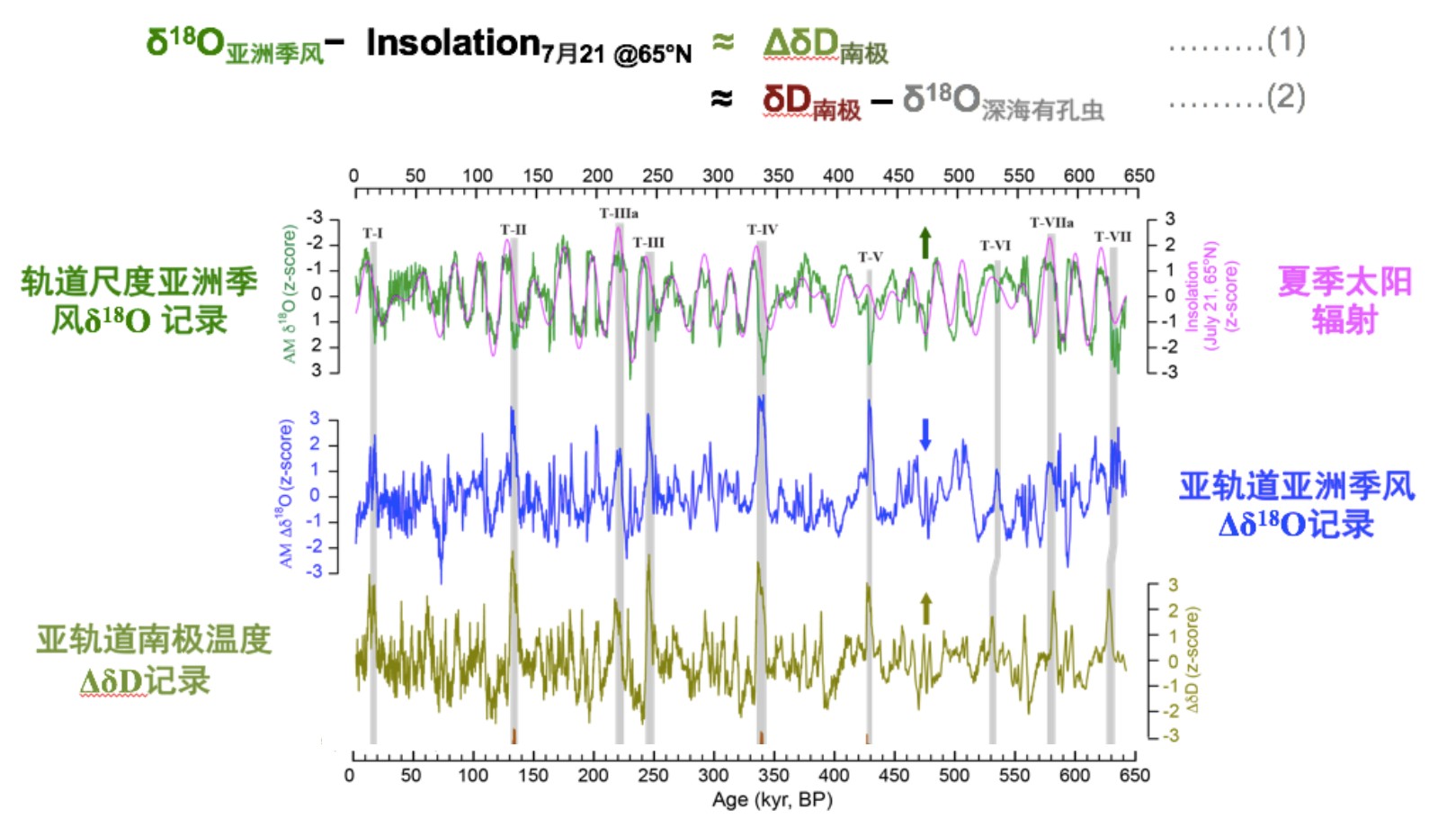 米兰科维奇从假说到理论,是被深海氧同位素的变化曲线所证实,但也正是这篇文章提出了该理论的深层次问题,即“十万年难题(100ka problem)”:太阳辐射的变化主要受岁差和地轴倾角参数变化的控制,在偏心率周期上的变化实际上是很弱的,然而在深海记录中偏心率的十万年周期是最强的。我们分别将亚洲季风记录(δ18O)和南极温度(δD)记录中的太阳辐射和长周期信号去掉,得到亚轨道尺度的变化,对比两者就可以发现亚轨道尺度亚洲季风记录(Δδ18O)与南极温度记录(ΔδD)的精确遥相关关系(图2)。