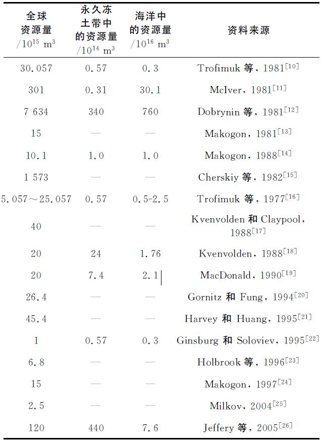 表2 全球陆地永久冻土带和海洋中的天然气水合物资源量