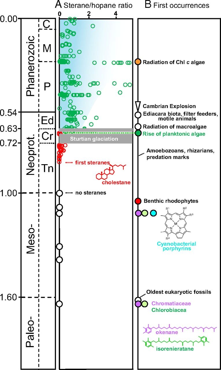 图1 生物标记物和化石数据的年代历史(Gueneli et al., 2018)