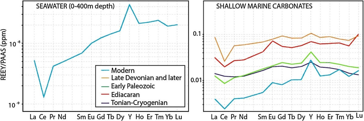 图1 现代海洋和地质历史时期碳酸盐岩的镧系元素的分布图解(Wallace et al., 2017)
