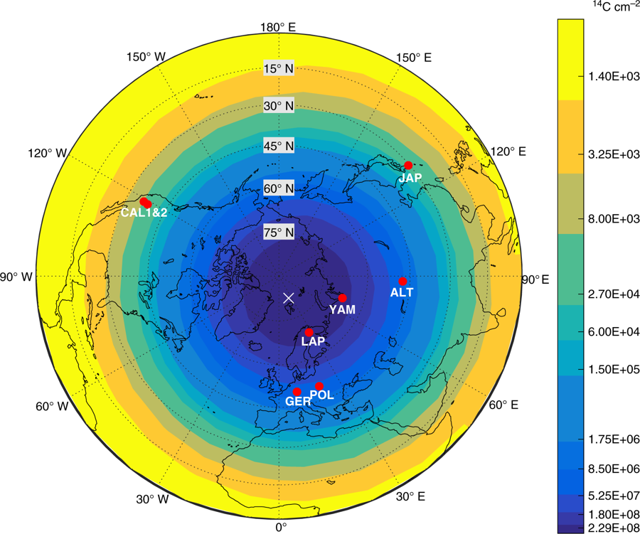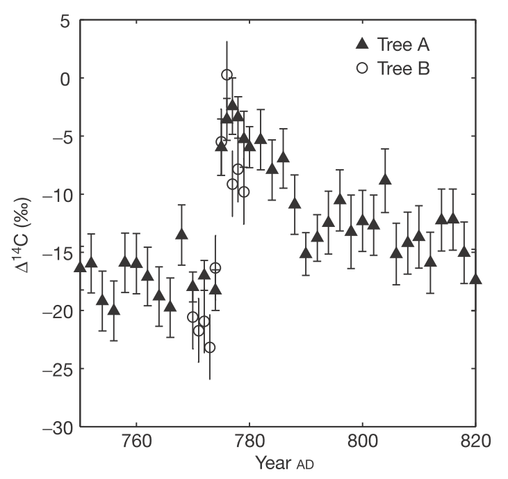 Jull A J, Panyushkina I P, Lange T E, et al. Excursions in the 14C record at AD 774-775 in tree rings from Russia and America[J]. Geophysical Research Letters, 2014, 41(8): 3004-3010.(原文链接)