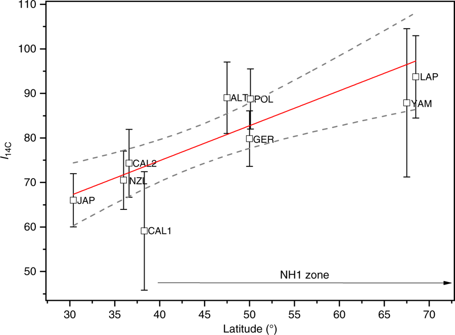 图3 774-775年太阳质子事件发生时,14C强度与纬度的关系 (Unsitalo et al., 2018)