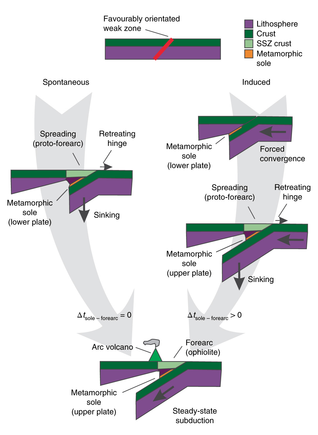 图1 自发俯冲VS.诱发俯冲概念图(Guilmette et al., 2018)