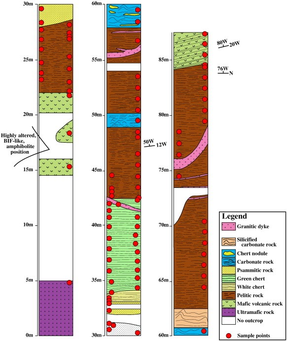 Komiya et al.通过对加拿大北部的Labrador地区发育的绿岩带进行研究[1],通过详细的填图以及年代学、地球化学分析,认为该地区出露的基性-超基性岩体以及沉积岩与现今的OPS建造即为相似,并经历了强烈的逆冲作用,岩性上呈现条带状重复的现象(图3),其形成年代早于3.95 Ga,因此,Komiya等人认为早在3.95 Ga就存在了典型的洋壳,并经历了大规模的水平运动,也就是板块构造。