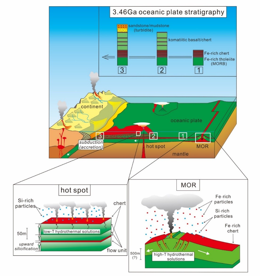 热液通道是发育于洋中脊等地的现象,存在于现今的洋壳以及太古宙的洋壳中,但是现今存在的热液通道和太古宙发育的热液通道有着明显的不同,Shibuya et al.根据热液蚀变太古代玄武岩绿岩的岩石学特征,进行了相平衡的热力学计算,以估算太古代玄武岩海底热液系统中的高温(类似于350℃)热液流体的组成[2]。结果表明:高CO2条件下蚀变矿物中存在方解石,热液流体具有高碱性,预测在太古代亚热带热液系统中产生富SiO2,贫铁热液流体。碱性热液流体和弱酸性中性海水之间的化学反应混合区的特征是与现代热液系统相反的pH和化学极性,导致硅和铁的氧化物在海底上/下广泛沉淀。这种过程可能是导致大量非生物成因的硅质岩石和二氧化硅岩脉,硅化作用的发生以及主要由太古代海洋中的氧化还原化学引起的pH控制的带状铁生成的原因。这种高温碱性流体在早期的海洋地球化学过程和早期的生命演化中都具有重要的作用。而Nakamura and Kato同样对皮尔巴拉克拉通的Marble Bar研究,发现了太古代(3.46 Ga)受热液侵蚀的玄武岩,玄武岩分为玄武岩和辉绿岩,玄武岩又分为Ⅰ型(具有原始火成岩纹理)和Ⅱ型(由于强烈的热液蚀变而缺乏这些纹理)[3]。主要单斜辉石斑晶储集在部分钙长石样品中,并且斑晶石(绿泥石+绿帘石+钠长石+石英±阳起石)变质矿物组合表明,蚀变条件为典型的绿片岩相。在其他样品中,所有原生矿物完全被次生矿物所取代,I型和II型玄武岩(绿泥石+钾云母+石英+碳酸盐矿物±钠长石)的蚀变矿物组合特征是存在钾云母碳酸盐矿物和绿帘石、阳起石等Ca-Al硅酸盐矿物的缺乏,提示高CO2逸度的变化条件。玄武岩与辉绿岩之间蚀变矿物组合的差异可能是由于水岩比的差异所决定的,而这种差异又取决于它们的孔隙度。正是因为对这些蚀变玄武岩的研究,可以确定在太古代时期存在着与现今相似的热液通道,进而可以得出结论:在太古代,存在着与现今类似的洋壳结构(图4)。
