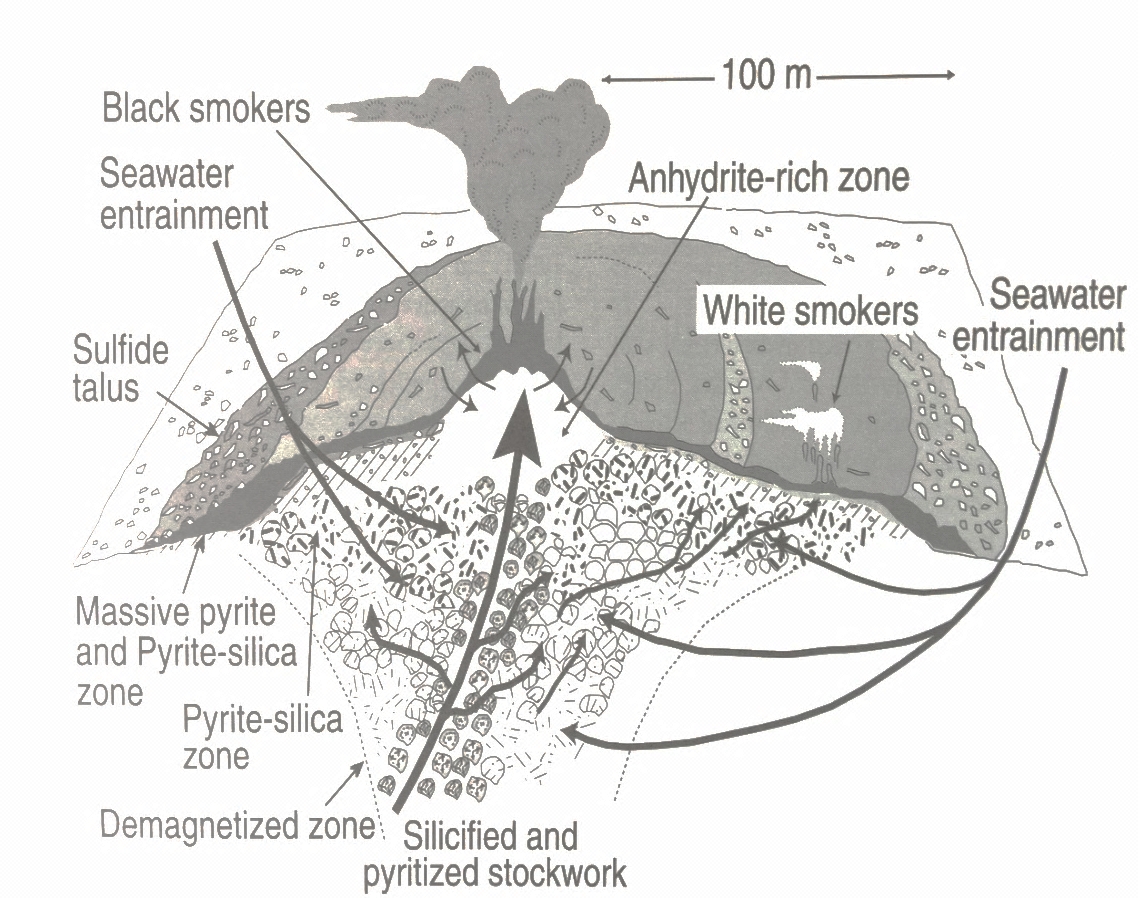 图5 现今发育在洋中脊的黑烟囱和白烟囱以及块状硫化物沉积结构图