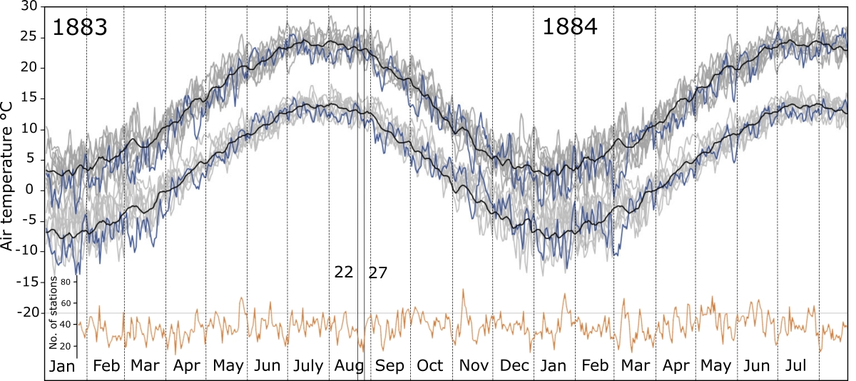 图3 1883年北美、欧洲、俄罗斯和澳大利亚47个站点测量的平均最高和最低日气温(蓝线)。橙色曲线显示记录降水的气象站数,它在1883年8月22-27日之间降至最低(间隔用实线垂直线表示)