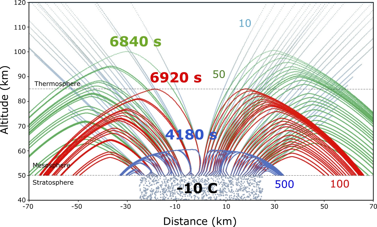 颗粒的动态模拟结果如图2所示,直径为50 nm、100 nm和500 nm的颗粒,从喷发柱(~10 库仑净电荷)通过对流上升到50 km高度后,可以在大约2小时内,分别达到110 km、90 km和60 km的高空。大型火山只要喷发的时间较长(如1991年皮纳图博火山喷发的高潮期为9小时),而悬浮颗粒在这段时间内保持带电,它们就有足够的时间抵达最大高度。当然,由于与大气中的正离子发生作用,火山颗粒的电荷会发生松弛,从而限制了悬浮时间。基于气体动力学理论,电荷弛豫时间约为100-1000 s。大的爆炸性火山喷发产生的火山灰通常是硅质的,这种材质的电荷弛豫时间更为长久。