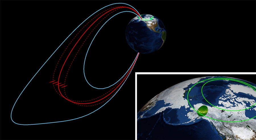 极区电离层中的极光点亮被认为是亚暴触发最清晰而直接的证据,超过90%的亚暴事件都能够在点亮的极光弧附近观测到类似珍珠状的“极光珠”,因此,极光珠被认为是亚暴触发的指示器之一。研究极光珠的精细结构及其产生机制能够为理解亚暴触发机制提供重要的参考信息。英国科学家Kalmoni等人近期在Nature Communication上发表最新研究成果,利用一种新颖的极光分析方法(state-of-the-art)得到极光珠色散关系(图2颜色区域),利用T96磁场模型,将极光珠区域投影到磁尾等离子体片区域,并基于理论计算得到该区域的剪切阿尔芬波色散关系(图2虚线),两者对比显示出非常好的一致性,由此推断,伴随亚暴的极光珠是由磁尾等离子体片中剪切阿尔芬波所携带的能量沿磁力线传播到极区电离层所激发(图3)。