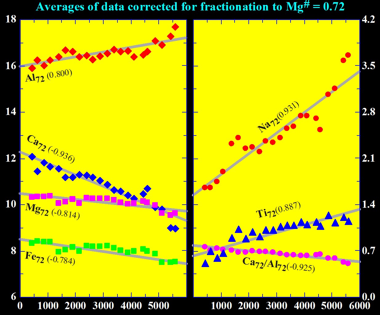 Niu and O'Hara (2008)MORB的组成进行结晶分异校正到Mg#等于0.72,因为Mg#0.72的岩浆是和地幔橄榄岩的橄榄石(Fo=89.6)平衡的。经过这样校正的MORB组成可以真实地反映地幔源区或者地幔过程信息。而Klein and Langmuir1987)对MORB的校正方法得到的MORB组成是和更为富Fe、非地幔来源的橄榄石平衡,不同程度上还是受到了结晶分异过程的影响。