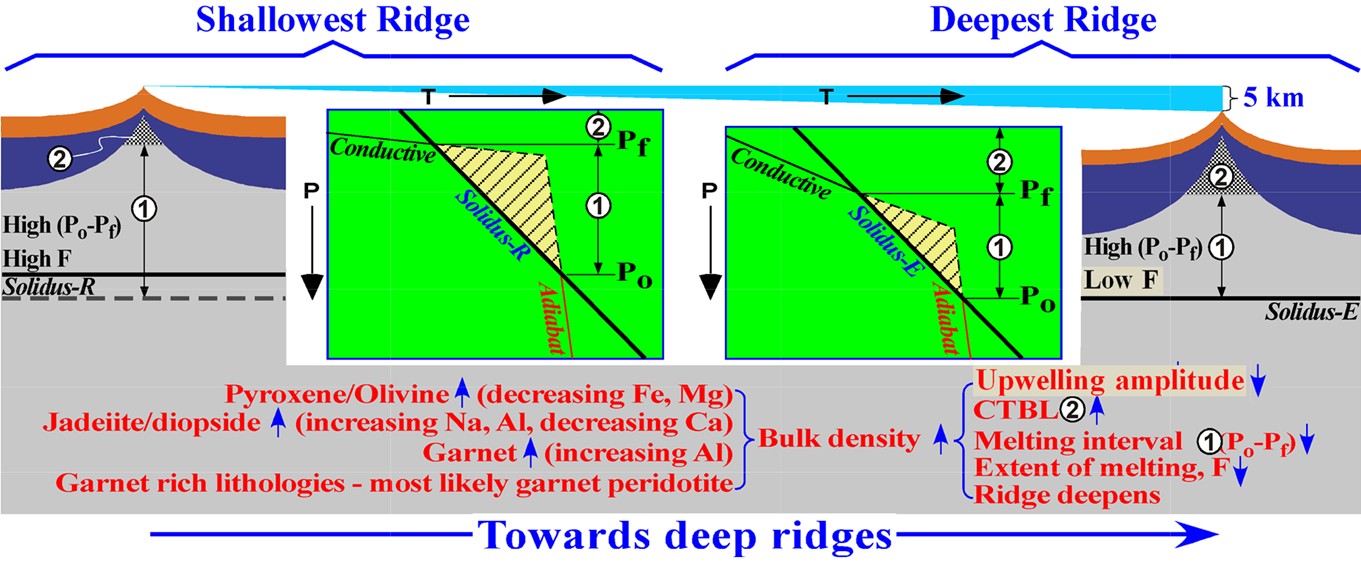因此,洋脊水深与洋脊玄武岩成分的内在联系是地幔源区的物质组成、密度差异。对于深脊地区,密度较大的地幔源区造成地幔上涌速率较小,因而传导散热较为低效,产生较厚的热边界层;同时也使得熔融在深度较高时停止,产生较短的部分熔融区间。较深、较小的部分熔融区域导致深脊地区不仅洋壳厚度较小,而且MORB的组分上更为富集。而对于浅脊地区,密度较小的地幔源区产生快速的地幔上涌和较薄的热边界层,因而具有较长的部分熔融区间,产生较厚的洋壳。快速、高效地地幔上涌以及较厚的洋壳是产生海底正地形、较小的洋脊水深的重要原因。