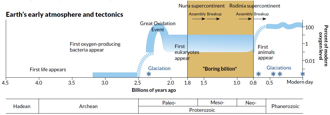 图1 地球大气氧气含量及生物演化概略图。其中18-8亿年期间,大气氧气含量较低,真核生物演化缓慢,被称为“无聊的十亿年” (图自Science News,修改自Lyons et al., 2014)
